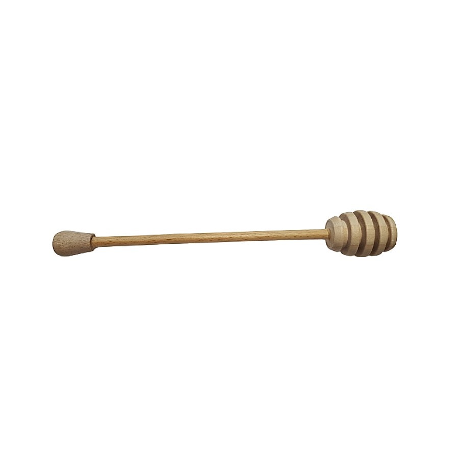 Drewniana czerpaczka o baryłkowatym kształcie z głębokimi nacięciami do nabierania płynnego miodu.